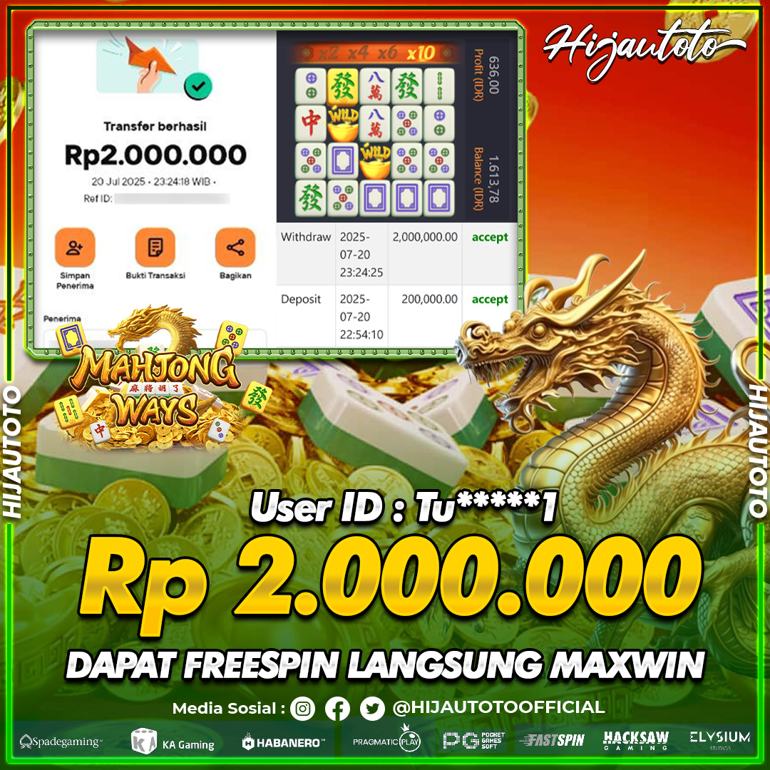 Selamat Kepada Member HIJAUTOTO J*****3 Telah Jackpot Di SLOT MAHJONG WAYS