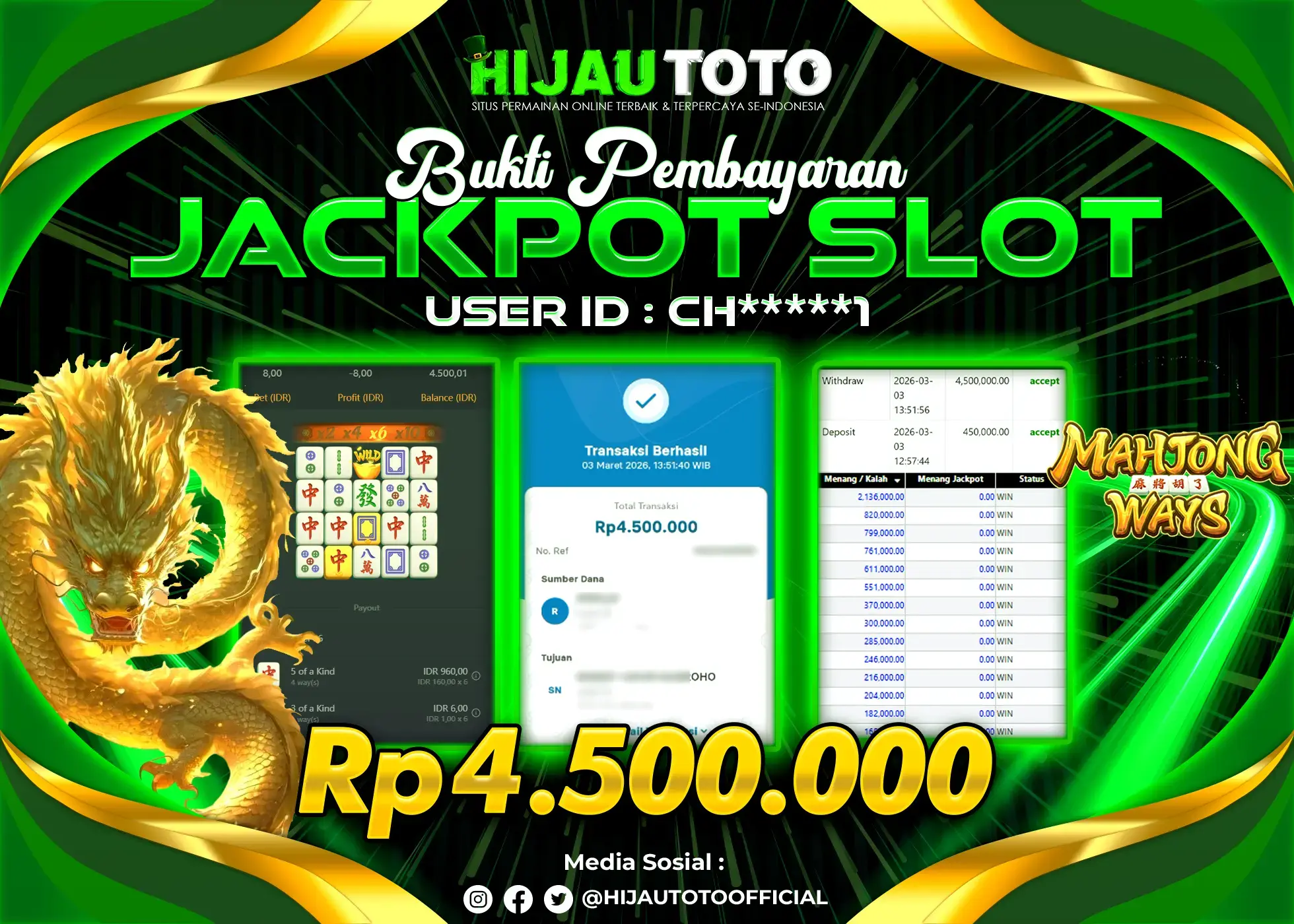 Bergabung dengan HIJAUTOTO sangat mudah dan cepat. Cukup lakukan pendaftaran dengan data lengkap, lakukan deposit minimal Rp5.000 melalui berbagai metode termasuk QRIS, dan mulai bertaruh dengan minimal taruhan Rp100. Dapatkan juga bonus new member 100% untuk modal bermain lebih besar.