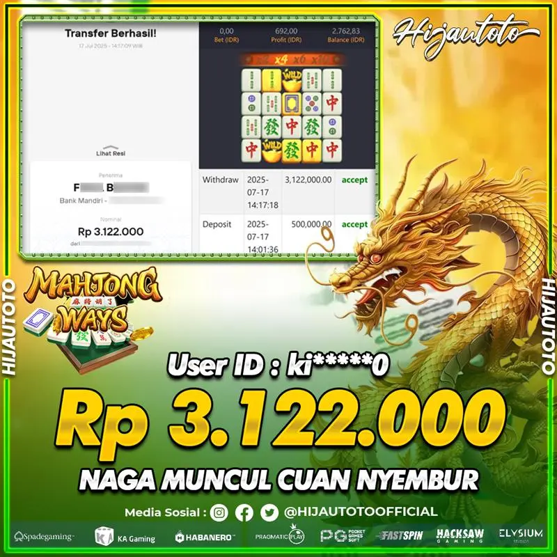 Karena berhasil memenangkan Rp.Rp.3.000.000 dari permainan seru SLOT MAHJONG WAYS di HIJAUTOTO! πŸ’°πŸ’Έ