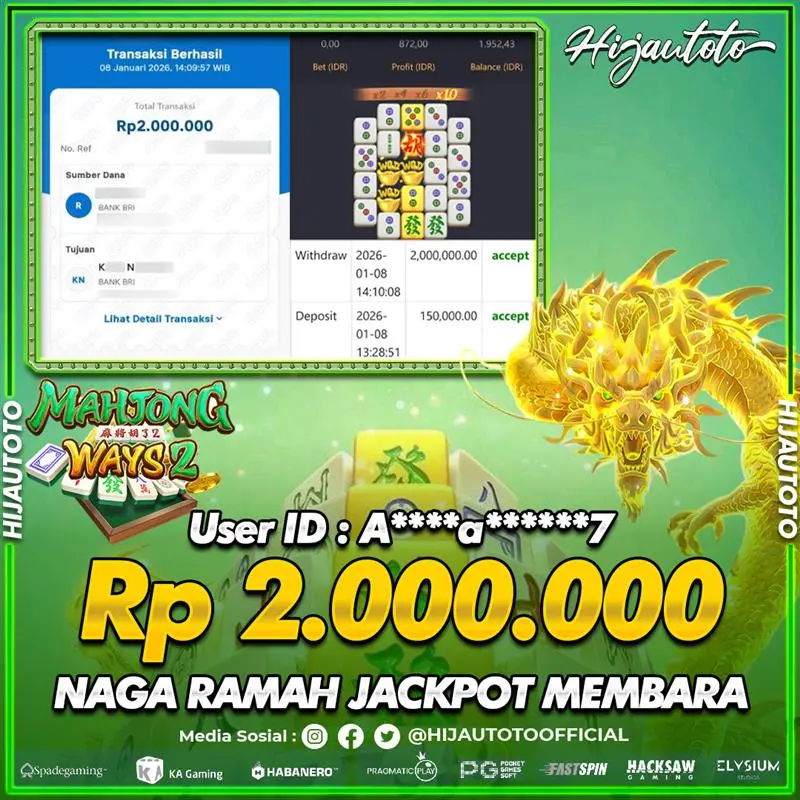 Selamat Kepada Member HIJAUTOTO A****A******7 Telah Jackpot Di SLOT MAHJONG WAYS 2