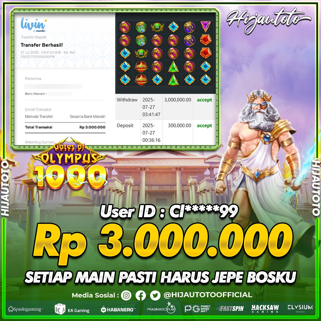 Selamat Kepada Member HIJAUTOTO CL*****99 Telah Jackpot Di SLOT GATES OF OLYMPUS 1000
