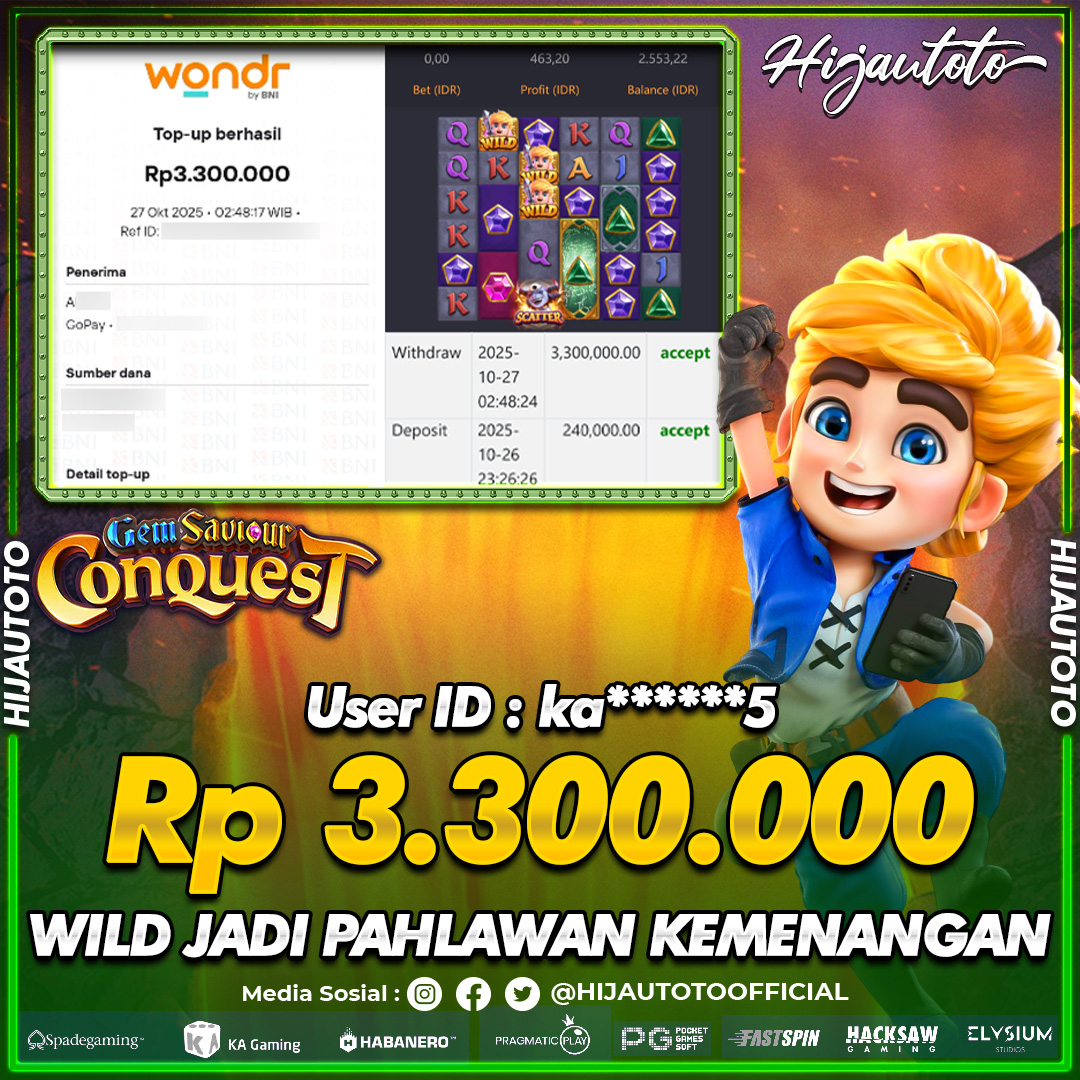 Selamat Kepada Member HIJAUTOTO KA******5 Telah Jackpot Di SLOT GEM SAVIOUR CONQUEST