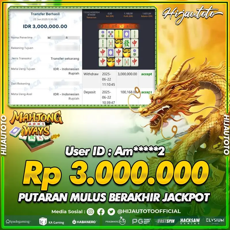 Selamat Kepada Member HIJAUTOTO MU*******99 Telah Jackpot Di SLOT MAHJONG WAYS